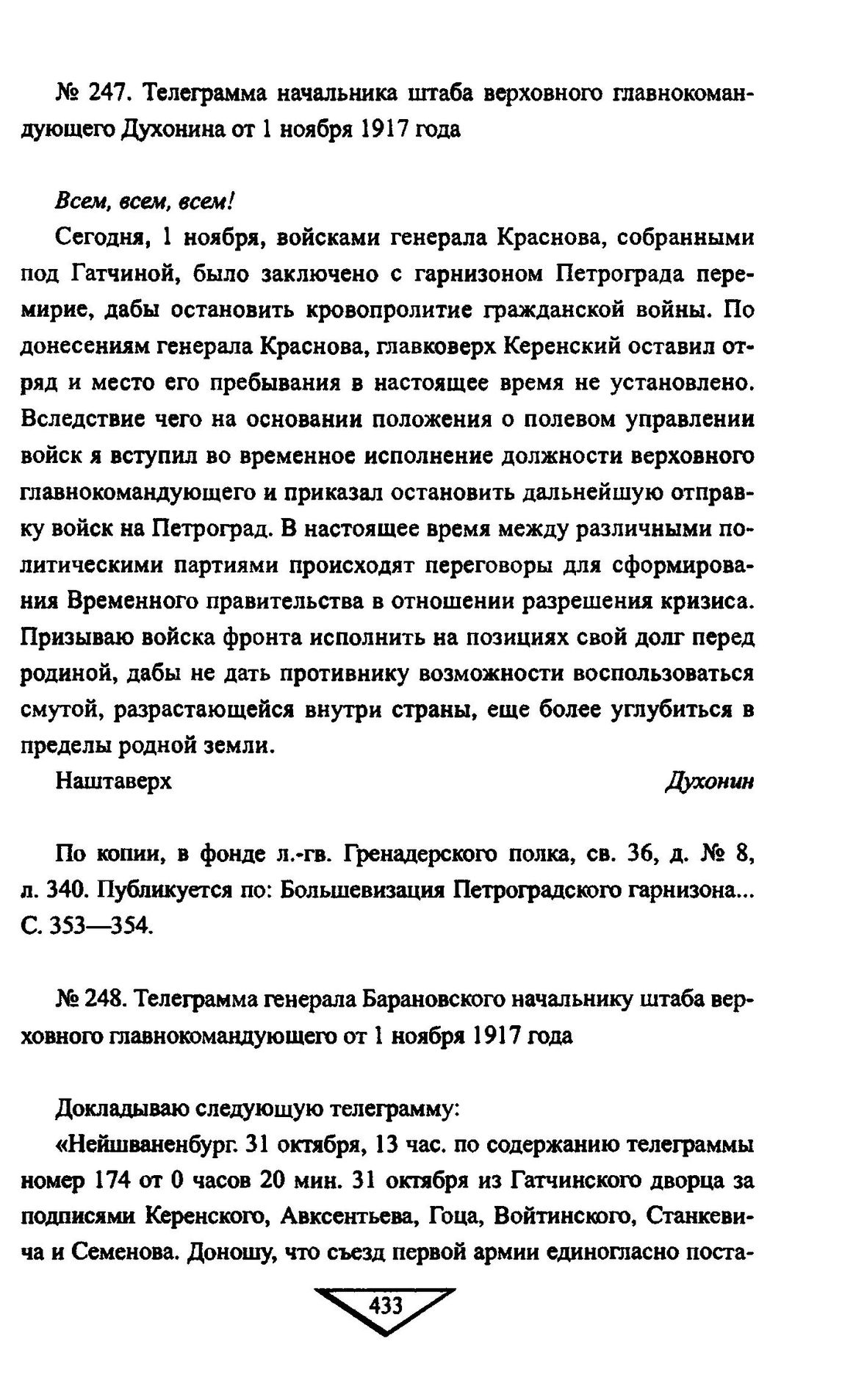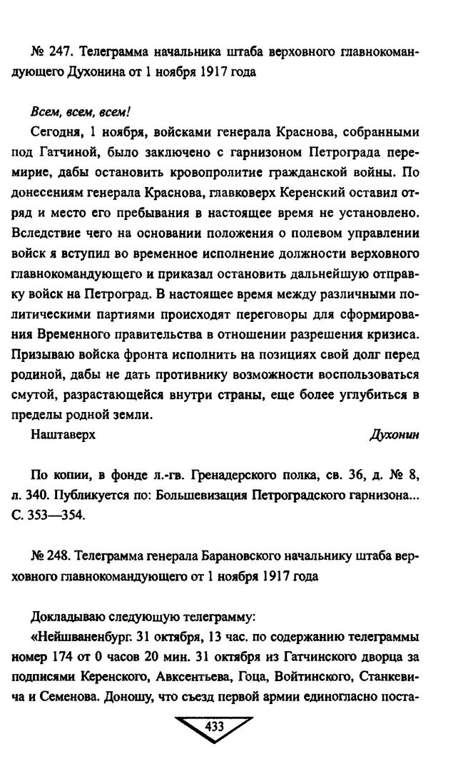 Телеграмма генерала Барановского начальнику штаба верховного главнокомандующего от 1 ноября 1917 года // В.-уч. Арх.; дело № 815; л. 198.