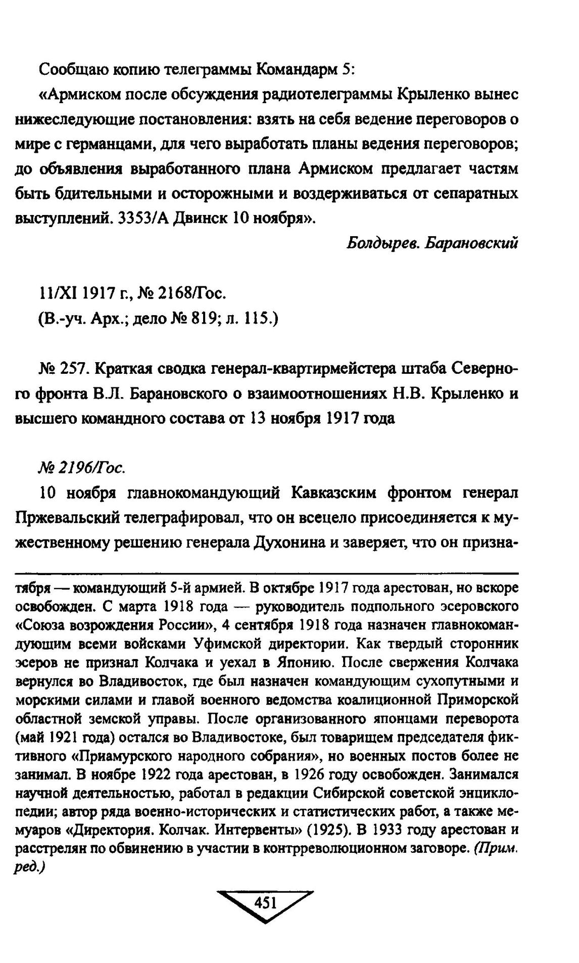 Краткая сводка генерал-квартирмейстера штаба Северного фронта В.Л. Барановского о взаимоотношениях Н.В. Крыленко и высшего командного состава от 13 ноября 1917 года // ЦГВИА, ф. 2031, оп. 1, д. 1550, л. 106-106 об. Заверенная копия. Приводится по: Октябрьская революция и армия. С. 110-111.