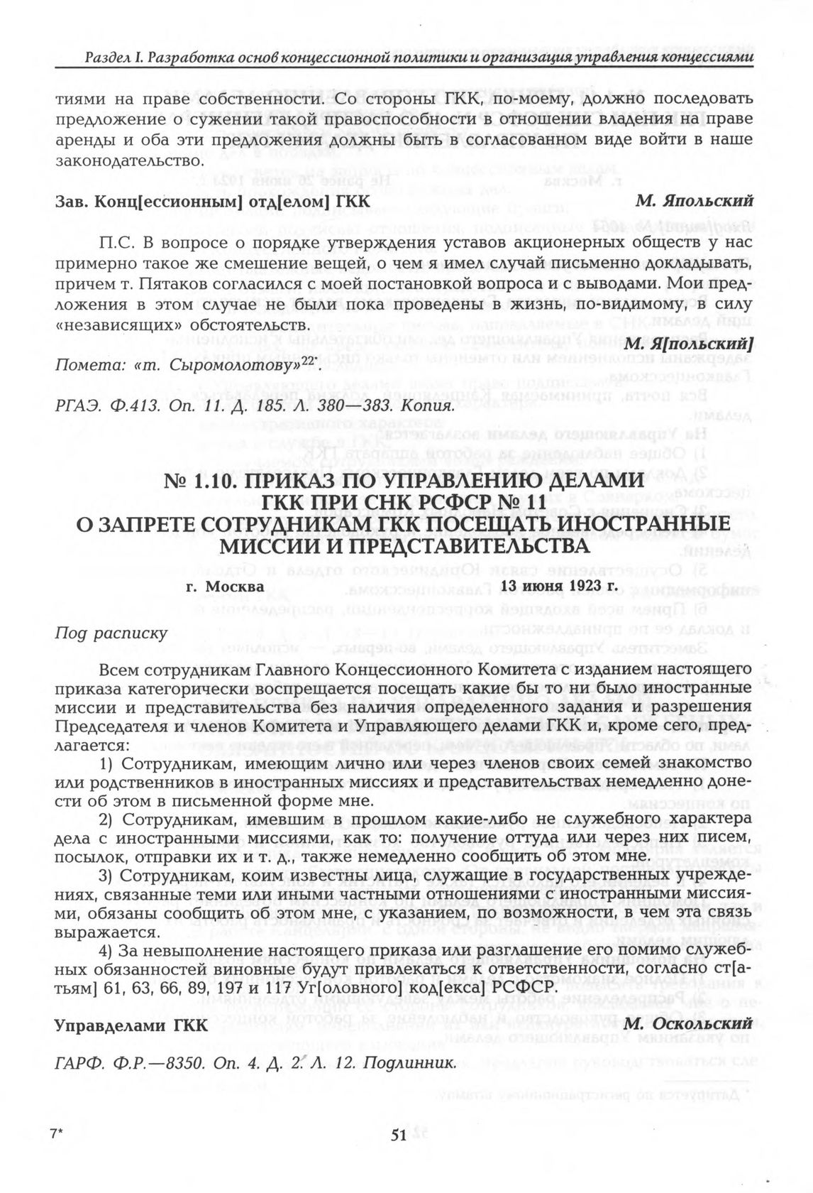 Приказ по управлению делами ГКК при СНК РСФСР № 11 о запрете сотрудникам ГКК посещать иностранные миссии и представительства. 13 июня 1923 г.