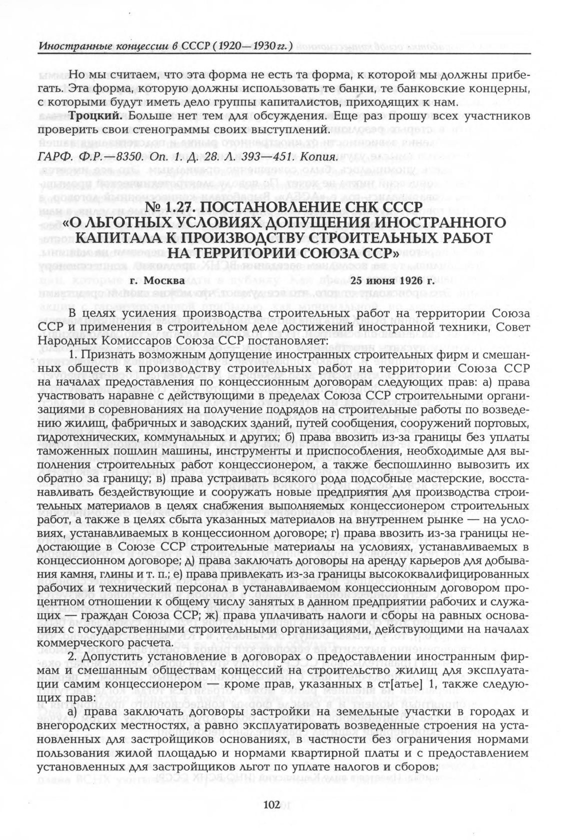 Постановление СНК СССР «о льготных условиях допущения иностранного капитала к производству строительных работ на территории Союза ССР». 25 июня 1926 г.