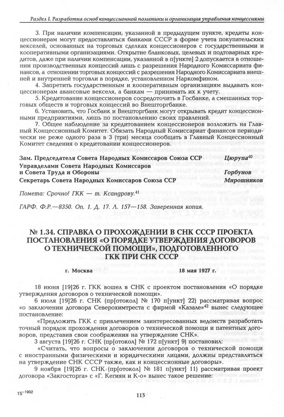 Справка о прохождении в СНК СССР проекта постановления «о порядке утверждения договоров о технической помощи», подготовленного ГКК при СНК СССР. 18 мая 1927 г. // ГАРФ. Ф. Р. — 8350. Oп. 3. Д. 310. Л. 250—251. Копия.