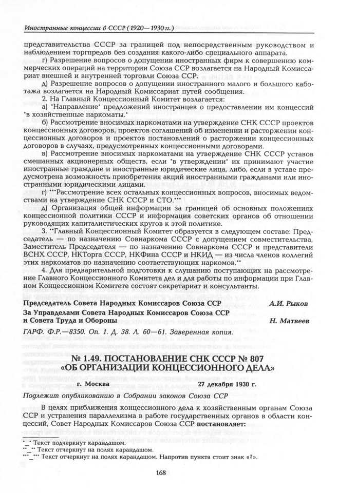 Постановление СНК СССР № 807 «Об организации концессионного дела». 27 декабря 1930 г. // ГАРФ. Ф. Р. — 8350. Oп. 4. Д. 38. Л. 6—7 об. Копия.