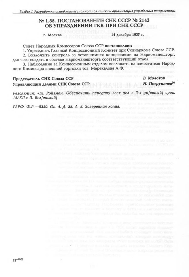 Постановление СНК СССР № 2143 «Об упразднении ГКК при СНК СССР». 14 декабря 1937 г. // ГАРФ. Ф. Р. — 8350. Oп. 4. Д. 38. Л. 8. Заверенная копия.
