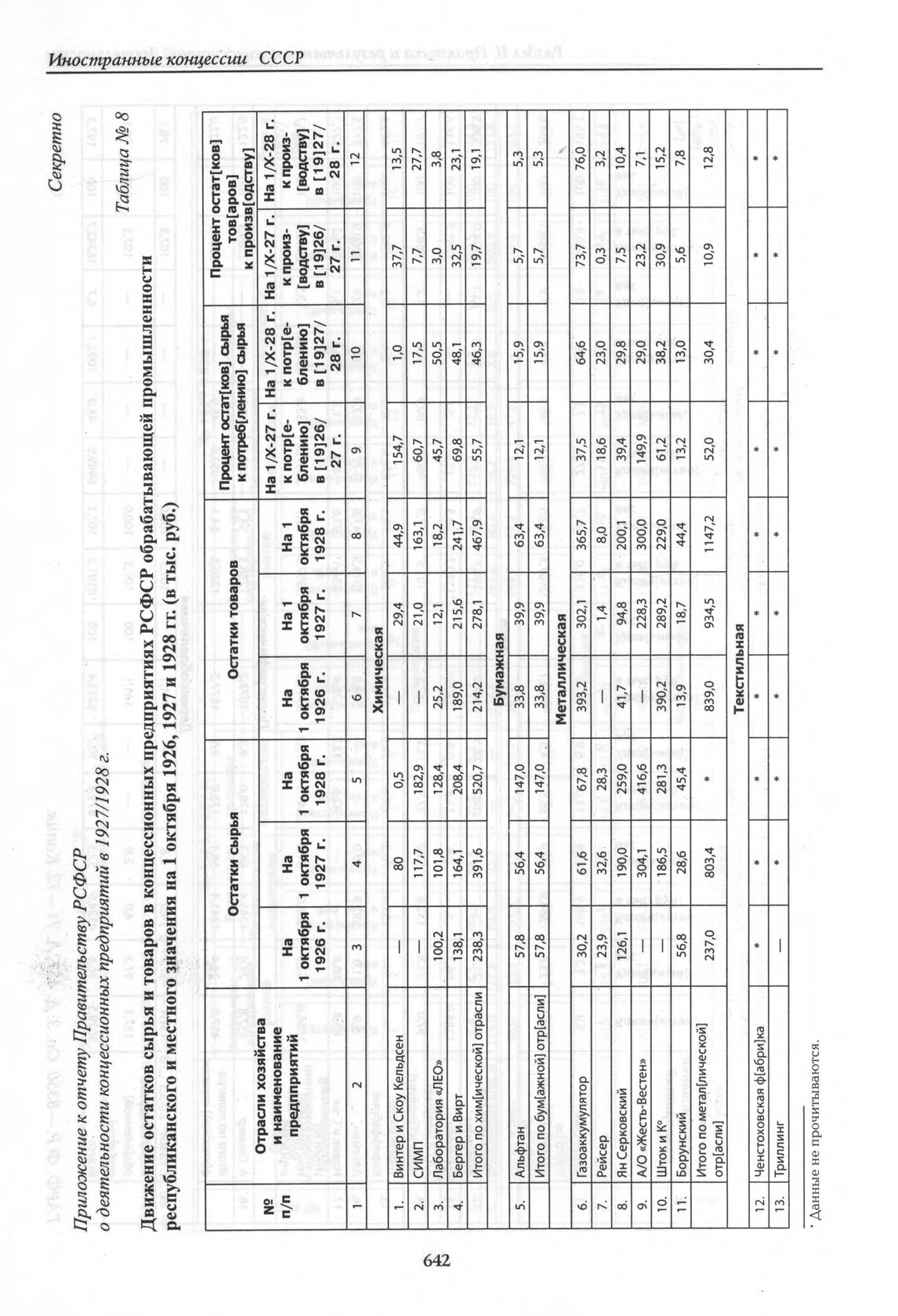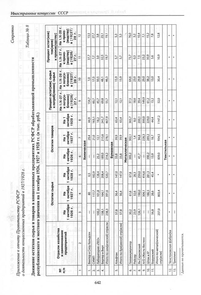 Приложение к отчету Правительству РСФСР о деятельности концессионных предприятий в 1927/1928 г. Таблица. Движение остатков сырья и и товаров в концессионных предприятиях РСФСР обрабатывающей промышленности республиканского и местного значения на 1 октября 1926, 1927, 1927 и 1928 гг. (в тыс. руб.) // ГАРФ. Ф. Р. — 8350. Oп. 3. Д. 457. Л. 73—74. Копия.