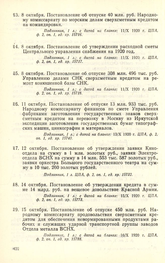 15 октября. Постановление об отпуске 450 млн. руб. Народному комиссариату продовольствия сверхсметным кредитом для обеспечения ненормированными продуктами рабочих и служащих ударной транспортной группы заводов Отдела металла ВСНХ // Подлинник, 1 л.; с датой на бланке: 16/Х 1920 г. ЦПА, ф. 2, oп. 7, ед. хр. 15788.
