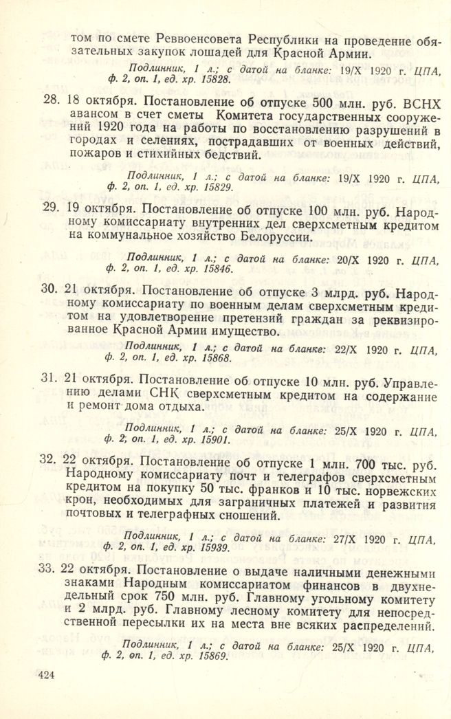 18 октября. Постановление об отпуске 500 млн. руб. ВСНХ авансом в счет сметы Комитета государственных сооружений 1920 года на работы по восстановлению разрушений в городах и селениях, пострадавших от военных действий, пожаров и стихийных бедствий