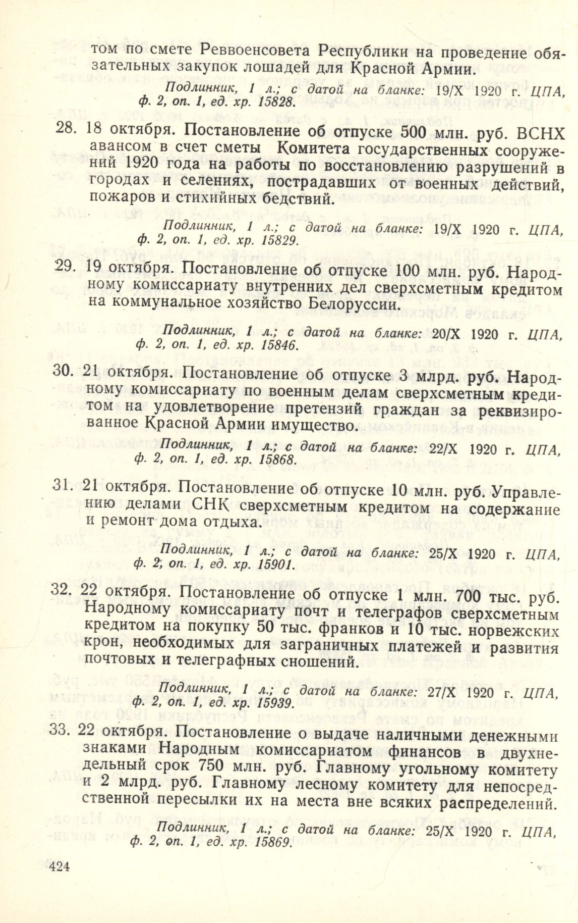 18 октября. Постановление об отпуске 500 млн. руб. ВСНХ авансом в счет сметы Комитета государственных сооружений 1920 года на работы по восстановлению разрушений в городах и селениях, пострадавших от военных действий, пожаров и стихийных бедствий // Подлинник, 1 л.; с датой на бланке: 19/Х 1920 г. ЦПА, ф. 2, oп. 1, ед. хр. 15829.