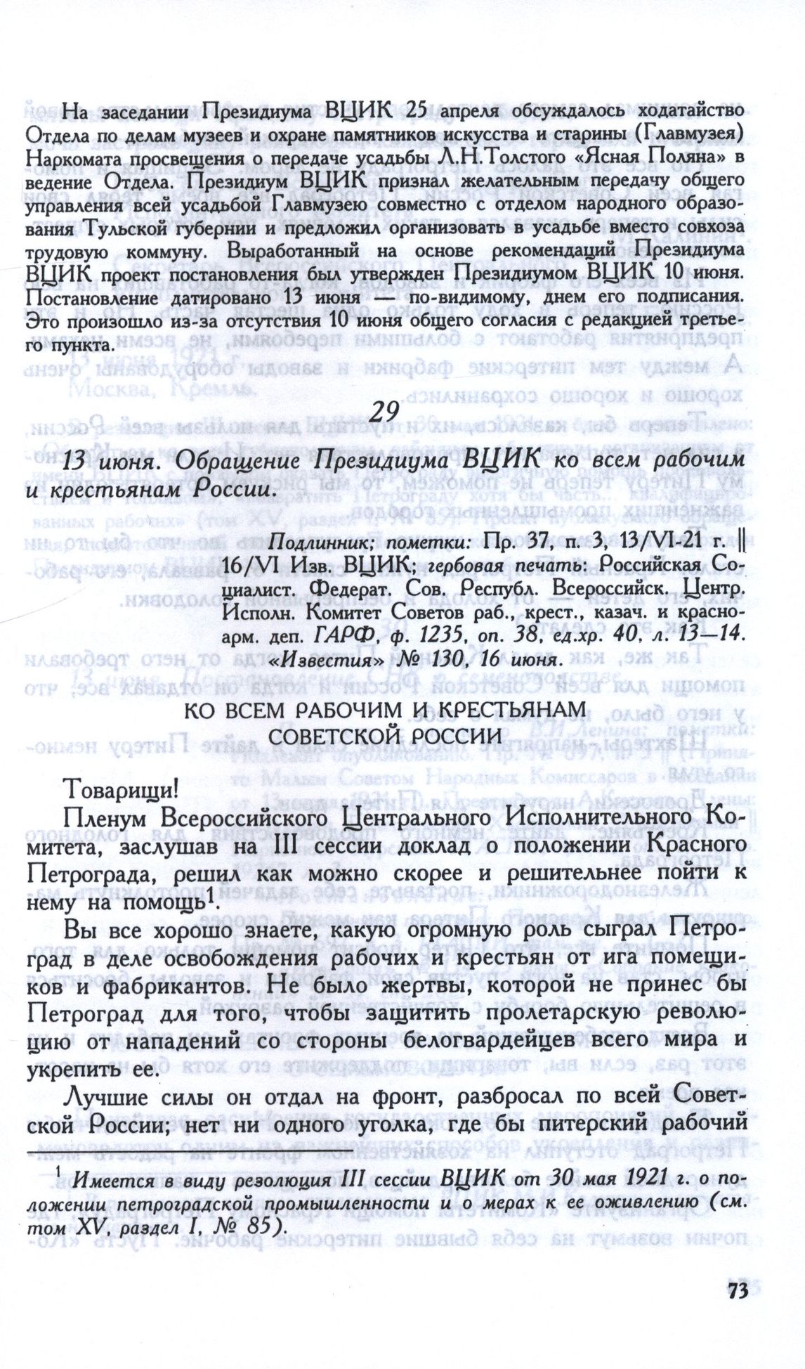 13 июня. Обращение Президиума ВЦИК ко всем рабочим и крестьянам России // Подлинник; пометки: Пр. 37, п. 3, 13/VI-21 г. || 16/VI Изв. ВЦИК; гербовая печать: Российская Социалист. Федерат. Сов. Республ. Всероссийск. Центр. Исполн. Комитет Советов раб., крест., казач. и красноарм. деп. ГА РФ, ф. 1235, oп. 38, ед.хр. 40, л. 13—14. «Известия» № 130, 16 июня.