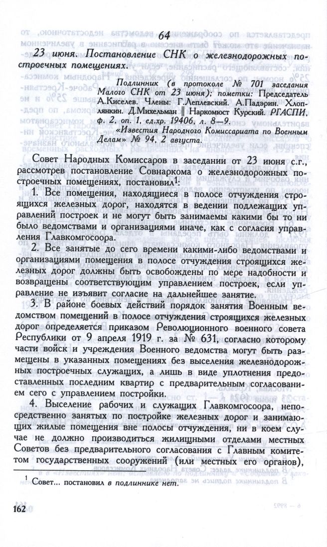 23 июня. Постановление СНК о железнодорожных построечных помещениях // Подлинник (в протоколе № 701 заседания Малого СНК от 23 июня); пометки: Председатель А.Киселев. Члены: Г.Леплевский. А.Падэрин. Хлоплянкин. Д.Михельман || Наркомюст Курский. РГАСПИ, ф. 2, oп. 1, ед.хр. 19406, л. 8—9. «Известия Народного Комиссариата по Военным Делам» № 94, 2 августа.