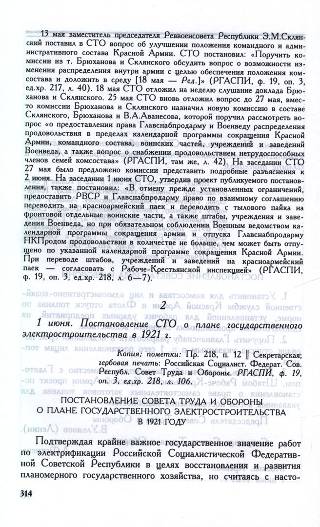 1 июня. Постановление СТО о плане государственного электростроительства в 1921 г. // Копия; пометки: Пр. 218, п. 12 || Секретарская; гербовая печать: Российская Социалист. Федерат. Сов. Республ. Совет Труда и Обороны. РГАСПИ, ф. 19, оп. 3, ед.хр. 218, л. 106.