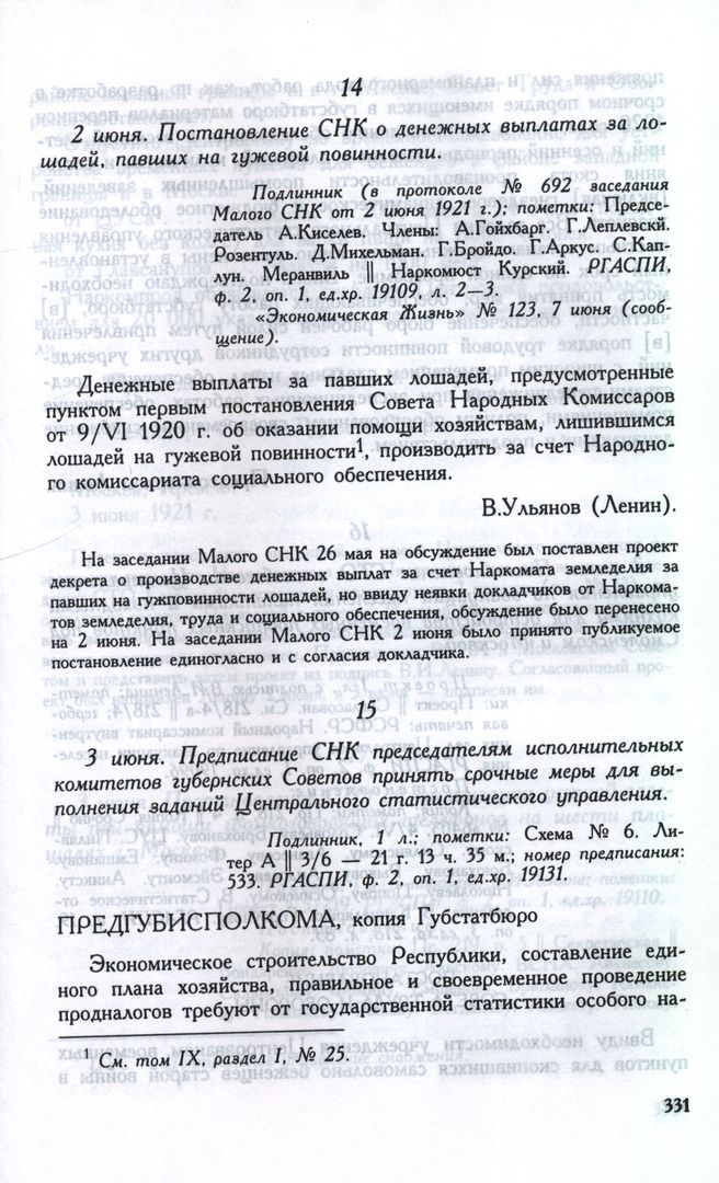 2 июня. Постановление СНК о денежных выплатах за лошадей, павших на гужевой повинности // Подлинник (в протоколе № 692 заседания Малого СНК от 2 июня 1921 г.); пометки: Председатель А.Киселев. Члены: А.Гойхбарг. Г.Леплевскй. Розентуль. Д.Михельман. Г.Бройдо. Г.Аркус. С.Каплун. Меранвиль || Наркомюст Курский. РГАСПИ, ф. 2, oп. 1, ед.хр. 19109, л. 2—3. «Экономическая Жизнь» № 123, 7 июня (сообщение).