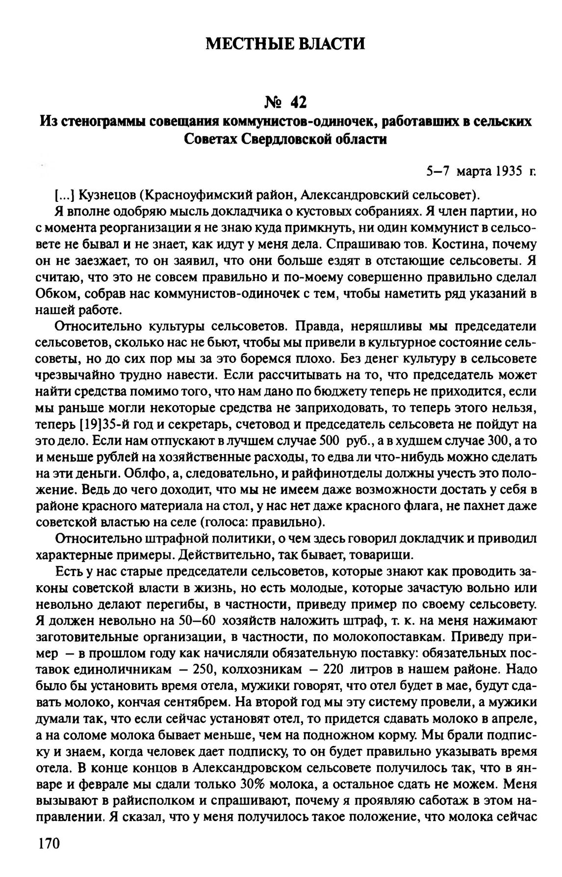 Из стенограммы совещания коммунистов-одиночек, работавших в сельских Советах Свердловской области. 5-7 марта 1935 г. // ЦДООСО. Ф. 4. Oп. 13. Д. 459. Л. 25-27, 45-49, 69-74. Подлинник. Машинопись.