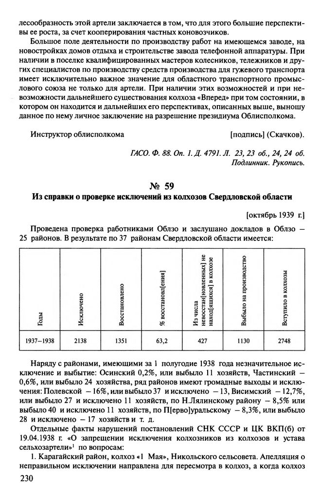 Из справки о проверке исключений из колхозов Свердловской области. [Октябрь 1939 г] // ЦДООСО. Ф. 4. Oп. 34. Д. 265. Л. 24-28. Подлинник. Машинопись.