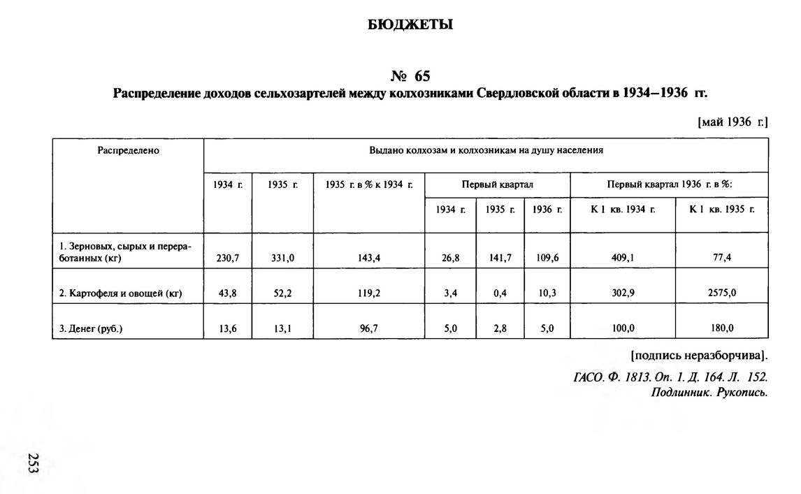 Распределение доходов сельхозартелей между колхозниками Свердловской области в 1934—1936 гг. [Май 1936 г.] // ГАСО. Ф. 1813. Oп. 1. Д. 164. Л. 152. Подлинник. Рукопись.