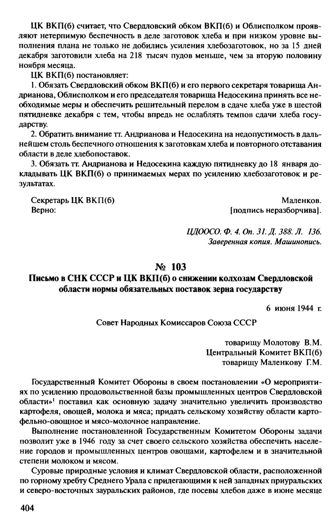 Письмо в СНК СССР и ЦК ВКП(б) о снижении колхозам Свердловской области нормы обязательных поставок зерна государству. 6 июня 1944 г. // ЦДООСО. Ф. 4. Oп. 31. Д. 680. Л. 63, 64. Подлинник. Машинопись.