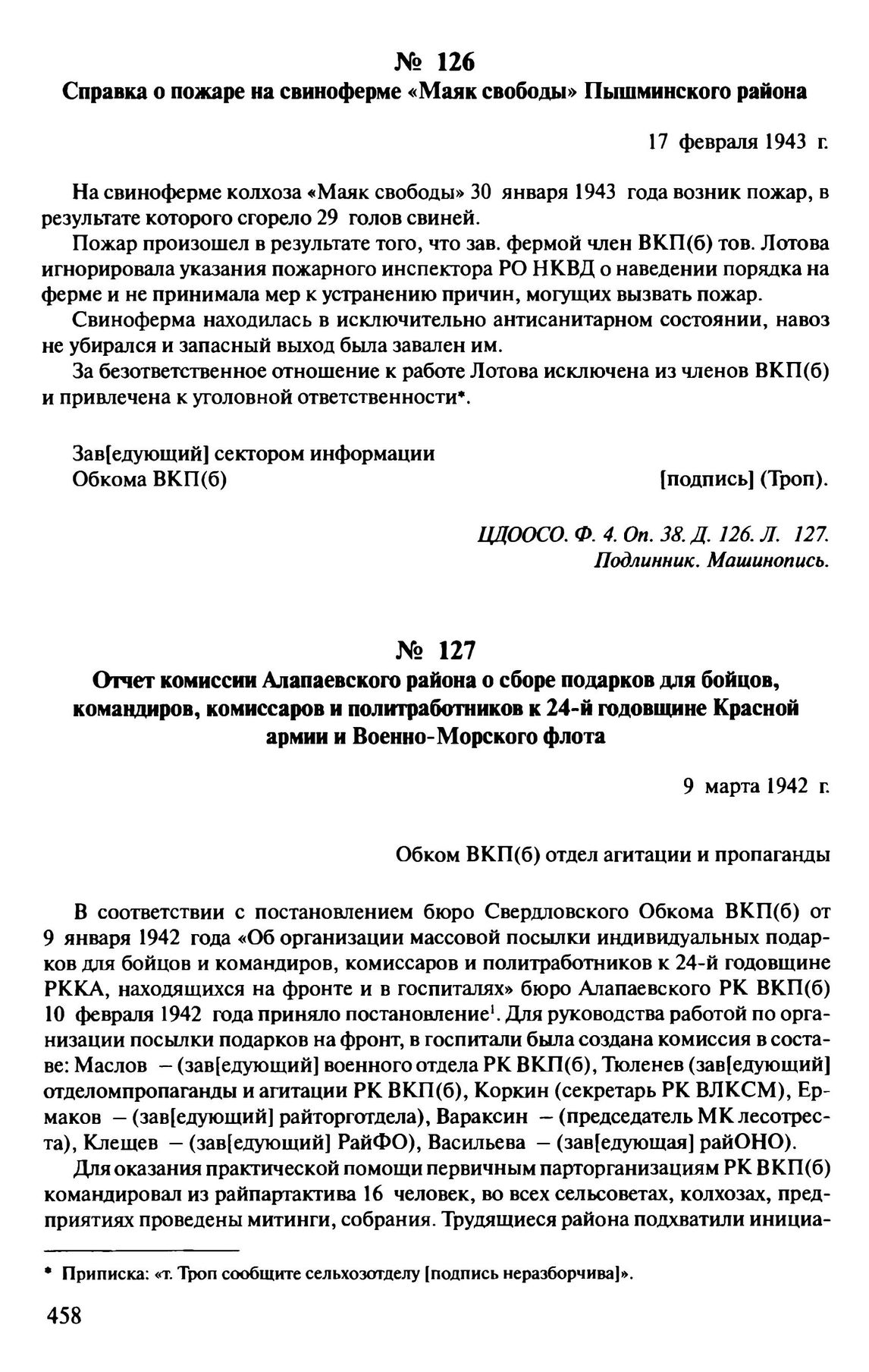 Справка о пожаре на свиноферме «Маяк свободы» Пышминского района. 17 февраля 1943 г. // ЦДООСО. Ф. 4. Oп. 38. Д. 126. Л. 127. Подлинник. Машинопись.