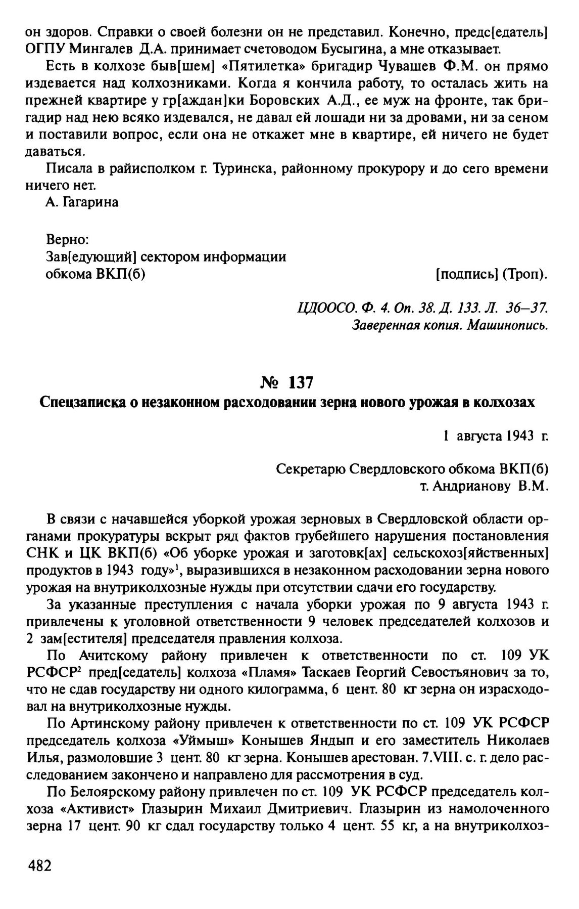 Спецзаписка о незаконном расходовании зерна нового урожая в колхозах. 1 августа 1943 г. // ЦДООСО. Ф. 4. Oп. 38. Д. 83. Л. 74, 75, 76. Подлинник. Машинопись.