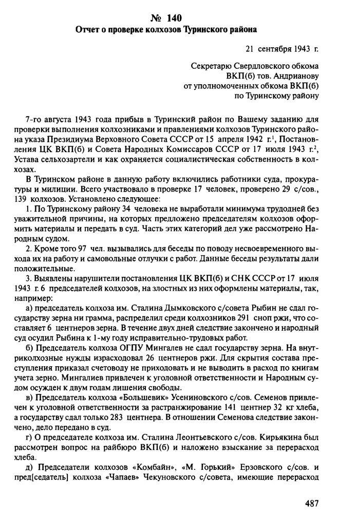 Отчет о проверке колхозов Туринского района. 21 сентября 1943 г. // ЦДООСО. Ф. 4. Oп. 38. Д. 83. Л. 179, 179 об., 180. Подлинник. Машинопись.