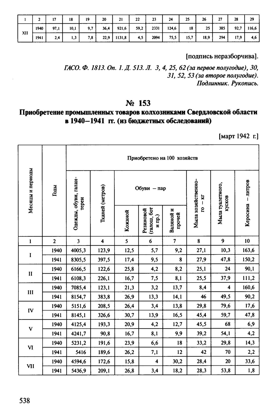 Приобретение промышленных товаров колхозниками Свердловской области в 1940-1941 гг. (из бюджетных обследований). [Март 1942 г.] // ГАСО. Ф. 1813. Oп. 1. Д. 513. Л. 5, 24 (за первое полугодие), 32, 51 (за второе полугодие). Подлинник. Рукопись.