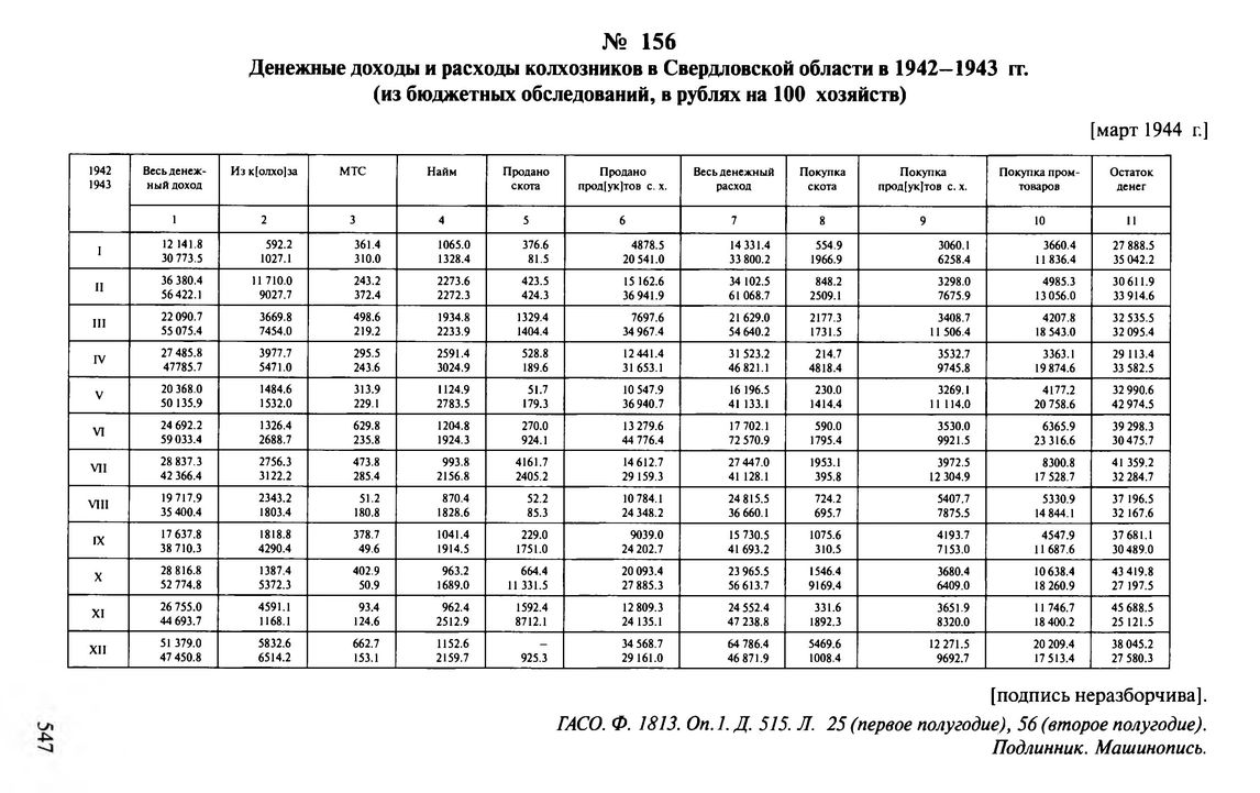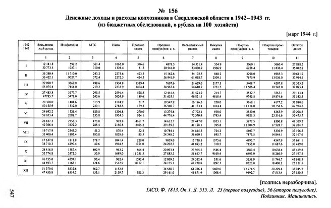 Денежные доходы и расходы колхозников в Свердловской области в 1942—1943 гг. (из бюджетных обследований, в рублях на 100 хозяйств). [Март 1944 г.] // ГАСО. Ф. 1813. Оп. 1. Д. 515. Л. 25 (первое полугодие), 56 (второе полугодие). Подлинник. Машинопись.