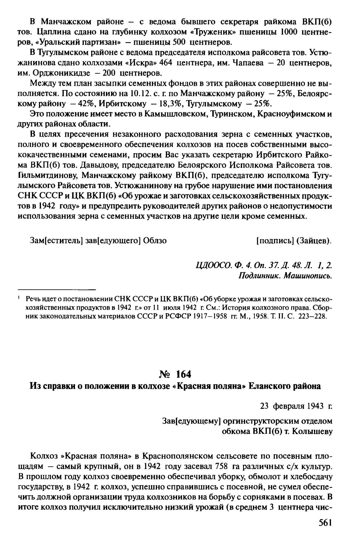 Из справки о положении в колхозе «Красная поляна» Еланского района. 23 февраля 1943 г. // ЦДООСО. Ф. 4. Oп. 36 Д. 126 Л. 12,13. Подлинник. Машинопись.