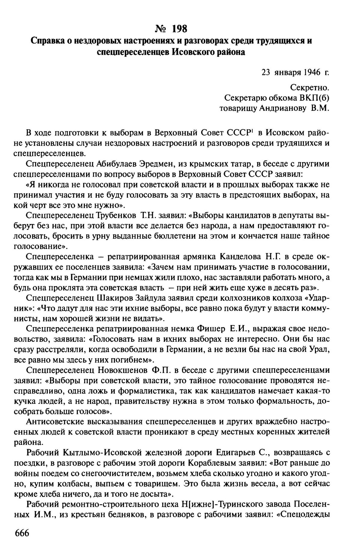 Справка о нездоровых настроениях и разговорах среди трудящихся и спецпереселенцев Исовского района. 23 января 1946 г.