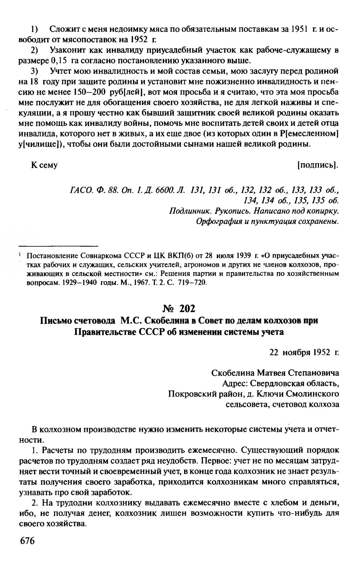 Письмо счетовода М.С. Скобелина в Совет по делам колхозов при Правительстве СССР об изменении системы учета. 22 ноября 1952 г. // ГАСО. Ф. 88. Oп. 1. Д. 6617. Л. 89. Заверенная копия. Машинопись.