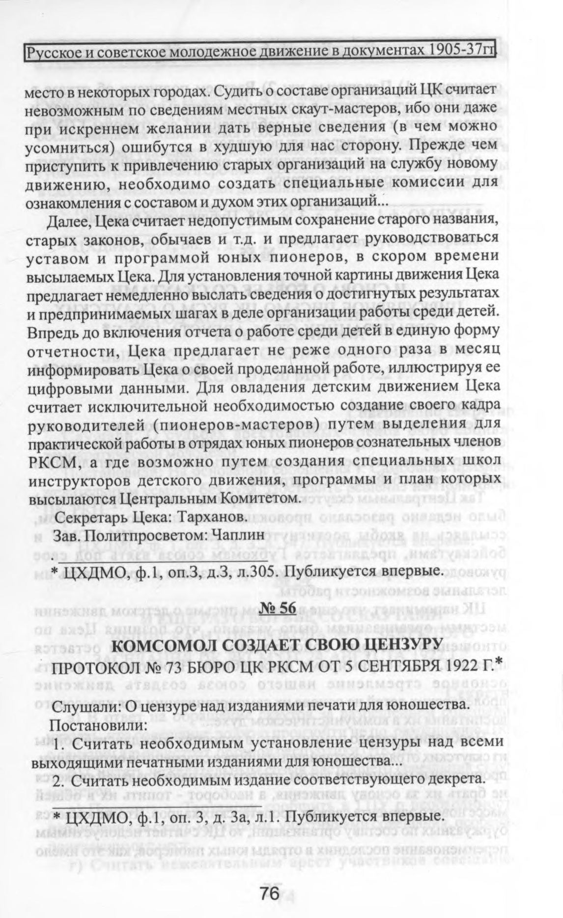 Комсомол создает свою цензуру. Протокол № 73 бюро ЦК РКСМ от 5 сентября 1922 г. // ЦХДМО, Ф. 1, Оп. 3, Д. 3а, Л.1. Публикуется впервые.