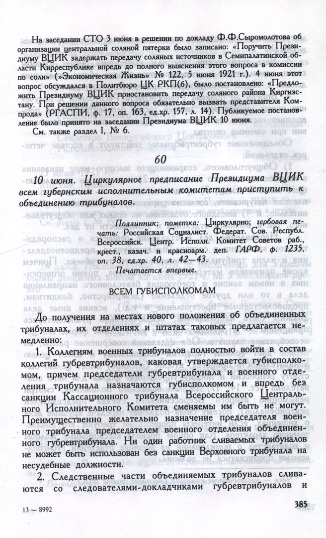 10 июня. Циркулярное предписание Президиума ВЦИК всем губернским исполнительным комитетам приступить к объединению трибуналов // Подлинник; пометка: Циркулярно; гербовая печать: Российская Социалист. Федерат. Сов. Республ. Всероссийск. Центр. Исполн. Комитет Советов раб., крест., казач. и красноарм. деп. ГА РФ, ф. 1235, оп. 38, ед.хр. 40. л. 42— 43. Печатается впервые.