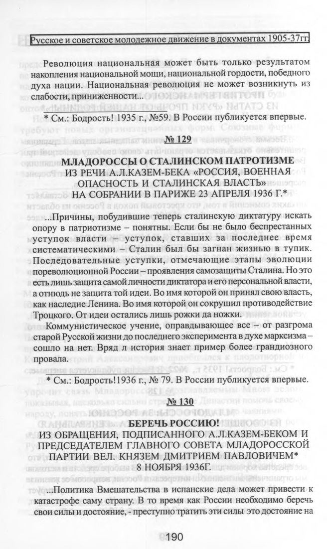 Беречь Россию!. Из обращения, подписанного А.Л. Казем-Беком и председателем главного Совета младоросской партии Вел. князем Дмитрием Павловичем 8 ноября 1936г. // См.: Бодрость! 1936 г., №106. В России публикуется впервые.