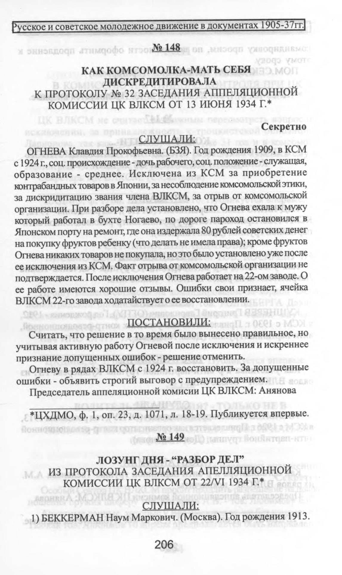 Лозунг дня - “разбор дел”. Из протокола заседания апелляционной комиссии ЦК ВЛКСМ от 22/VI 1934 г. // ЦХДМО, Ф. 1, Оп. 23, Д. 1071, Л. 22-23. Публикуется впервые.