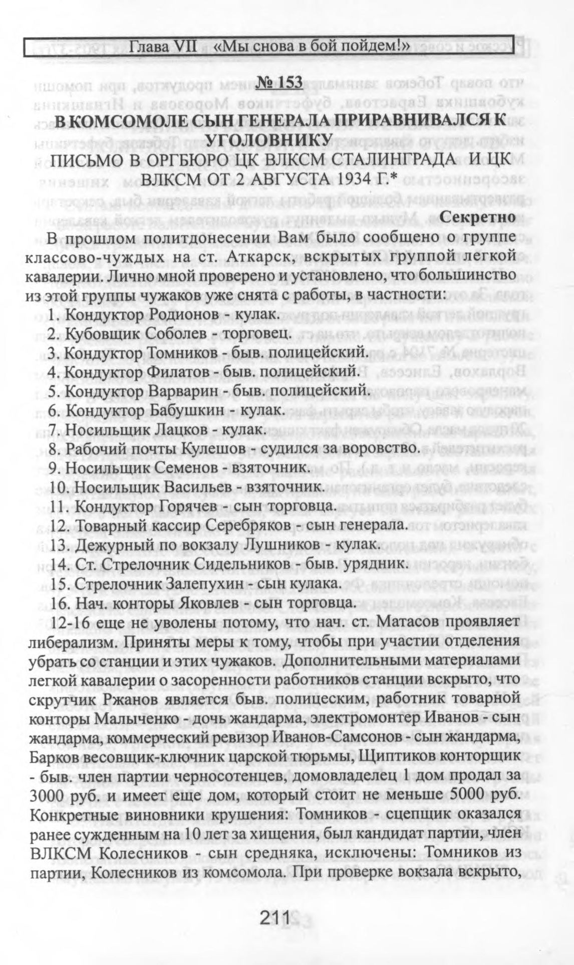 В комсомоле сын генерала приравнивался к уголовнику. Письмо в оргбюро ЦК ВЛКСМ Сталинграда и ЦК ВЛКСМ от 2 августа 1934 г. // ЦХДМО, Ф. 1, Оп. 23, Д. 1072, Л. 3, 4. Публикуется впервые.