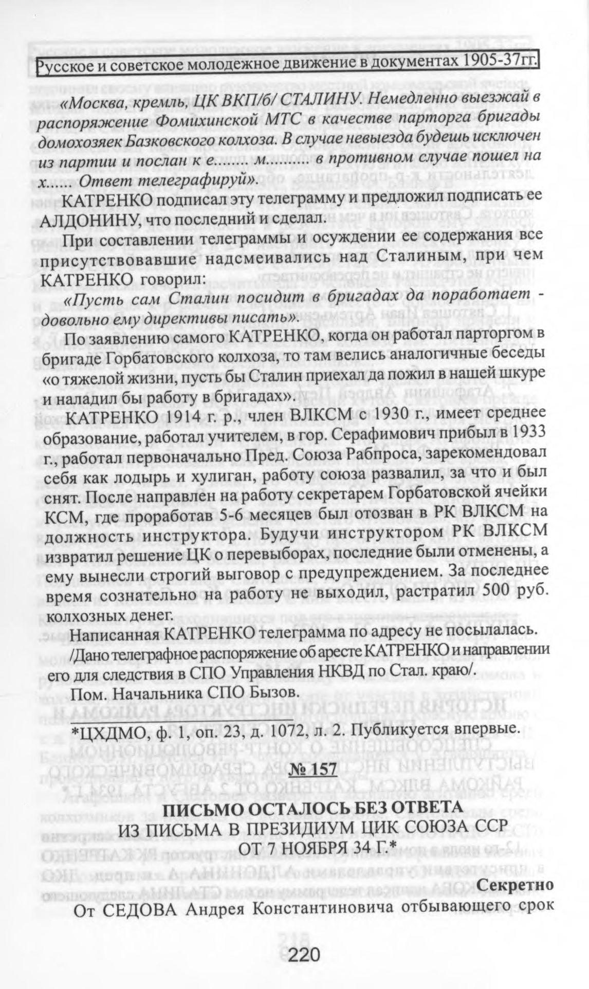 Письмо осталось без ответа. Из письма в Президиум ЦИК Союза ССР от ...