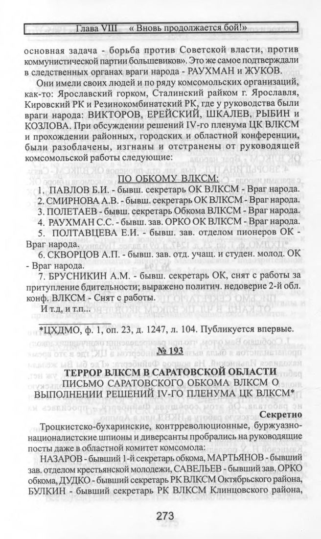 Террор ВЛКСМ в Саратовской области. Письмо Саратовского обкома ВЛКСМ о выполнении решений IV-го пленума ЦК ВЛКСМ // ЦХДМО, Ф. 1, Оп.23, Д. 1247, Л. 69 и далее. Публикуется впервые.