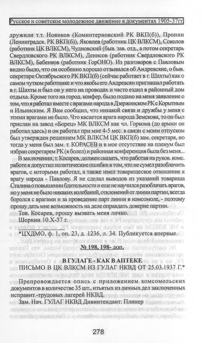 В ГУЛАГе - как в аптеке. Письмо в ЦК ВЛКСМ из ГУЛАГ НКВД от 25.03.1937 г. // ЦХДМО, Ф. 1, Оп. 23, Д. 1246, Л. 97-99. Публикуется впервые.