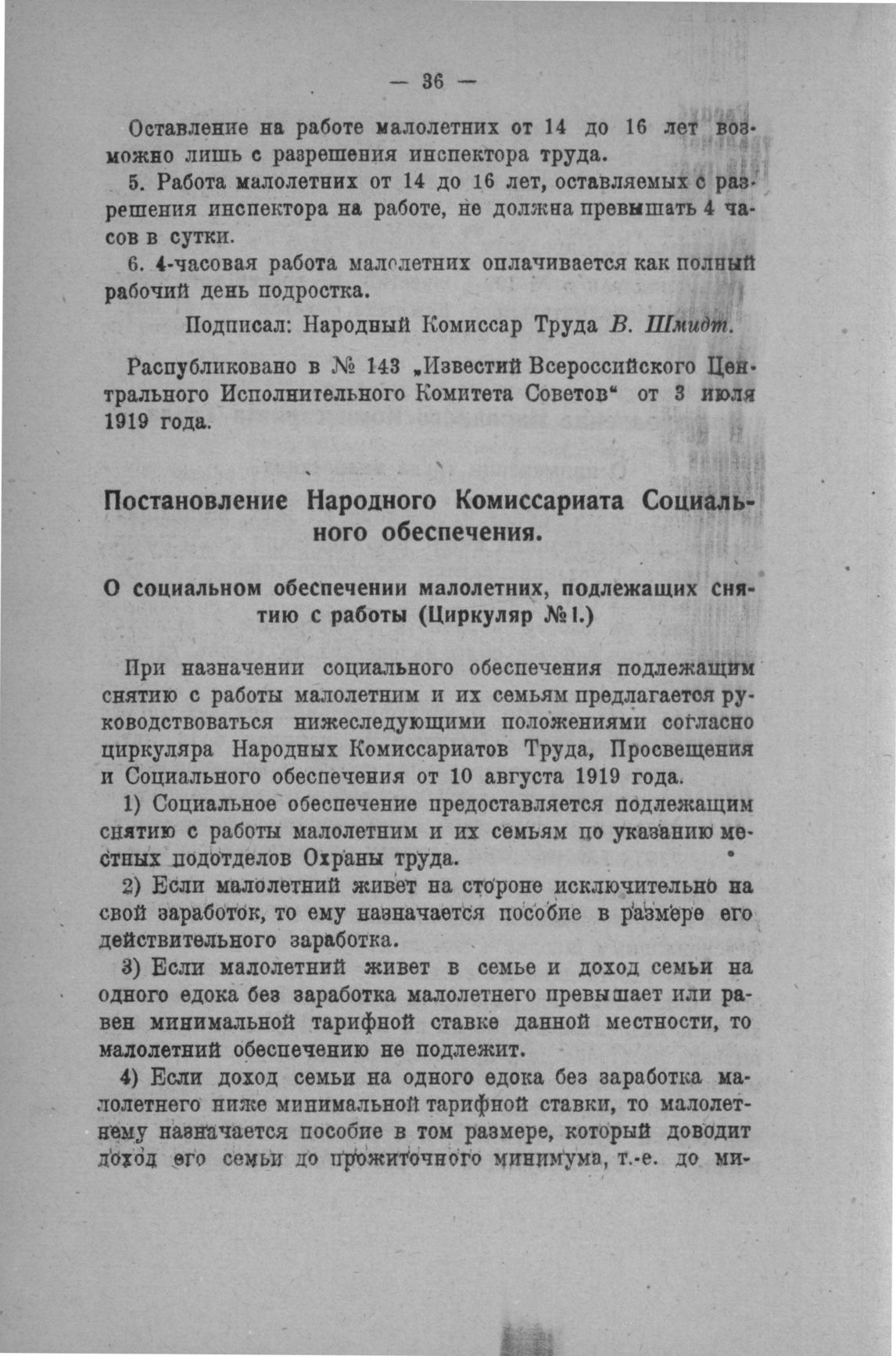 Постановление Народного Комиссариата Социального обеспечения. О социальном обеспечении малолетних, подлежащих снятию с работы (Циркуляр №1)