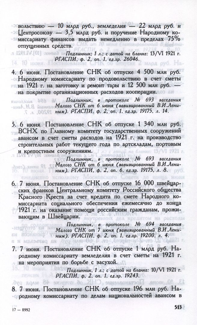 6 июня. Постановление СНК об отпуске 1 340 млн руб. ВСНХ по Главному комитету государственных сооружений авансом в счет сметы расходов на 1921 г. на производство строительных работ текущего года по артскладам, портовым и крепостным сооружениям // Подлинник, в протоколе № 693 заседания Малого СНК от 6 июня (завизированный В.И.Лениным). РГАСПИ, ф. 2, oп. 6, ед.хр. 19175, л. 8.