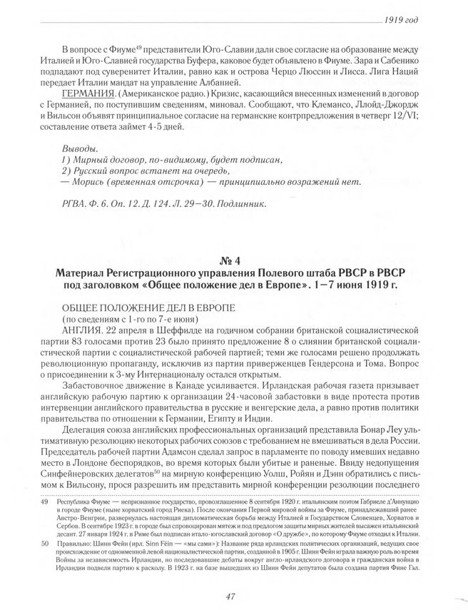 Материал Регистрационного управления Полевого штаба РВСР в РВСР подзаголовком «Общее положение дел в Европе». 1-7 июня 1919 г.