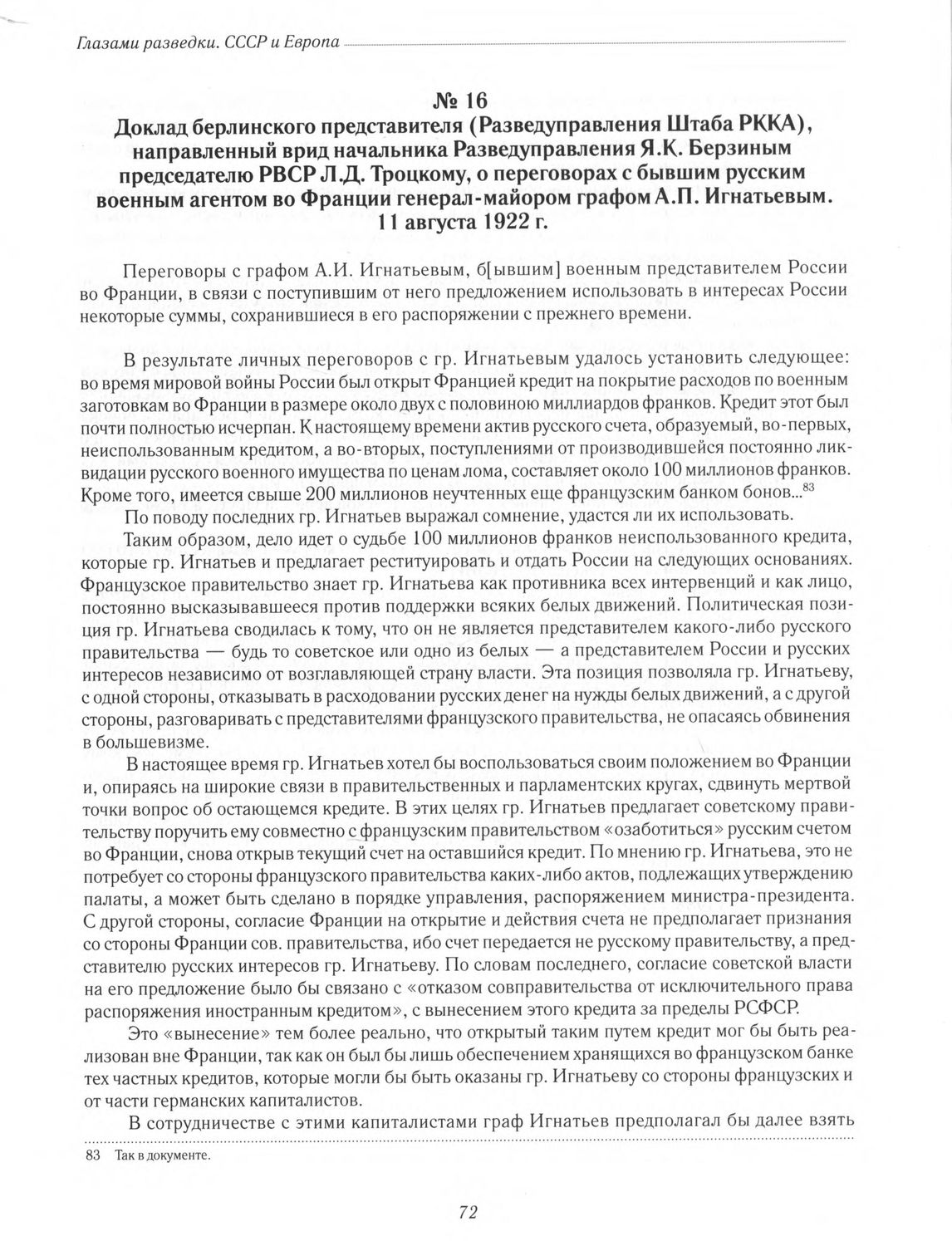 Доклад берлинского представителя (Разведуправления Штаба РККА), направленный врид начальника Разведуправления Я. К. Берзиным председателю РВСР Л. Д. Троцкому, о переговорах с бывшим русским военным агентом во Франции генерал-майором графом А. П. Игнатьевым. 11 августа 1922 г. // РГВА. Ф. 33988. Оп. 2. Д. 714. Л. 385-387. Копия.