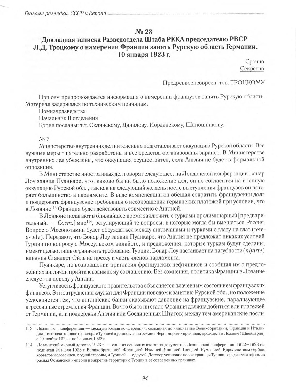 Докладная записка Разведотдела Штаба РККА председателю РВСР Л. Д. Троцкому о намерении Франции занять Рурскую область Германии. 10 января 1923 г.