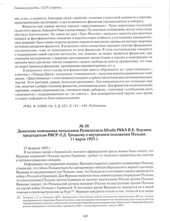 Донесение помощника начальника Разведотдела Штаба РККА Я. К. Берзина председателю РВСР Л. Д. Троцкому о внутреннем положении Польши. 11 марта 1923 г. // РГВА. Ф. 33988. Оп. 2. Д. 531. Л. 165-168. Подлинник.