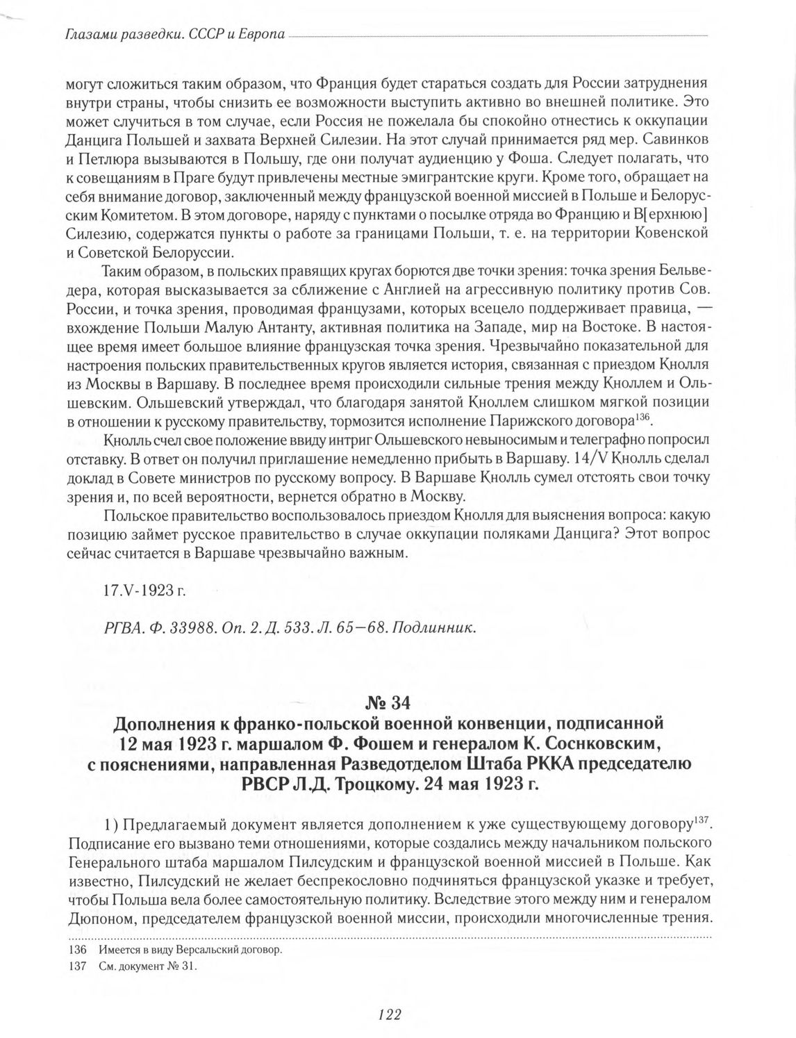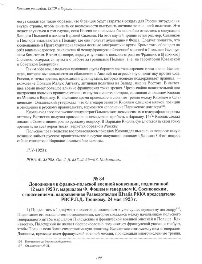 Дополнения к франко-польской военной конвенции, подписанной 12 мая 1923 г. маршалом Ф. Фошем и генералом К. Соснковским, с пояснениями, направленная Разведотделом Штаба РККА председателю РВСР Л. Д. Троцкому. 24 мая 1923 г.