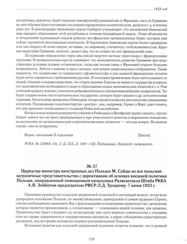 Циркуляр министра иностранных дел Польши М. Сейды во все польские заграничные представительства с директивами об основах внешней политики Польши, направленный помощником начальника Разведотдела Штаба РККА А. Я. Зейботом председателю РВСР Л. Д. Троцкому. 7 июня 1923 г. // РГВА. Ф. 33988. Оп. 2. Д. 533. Л. 161-164. Подлинник.