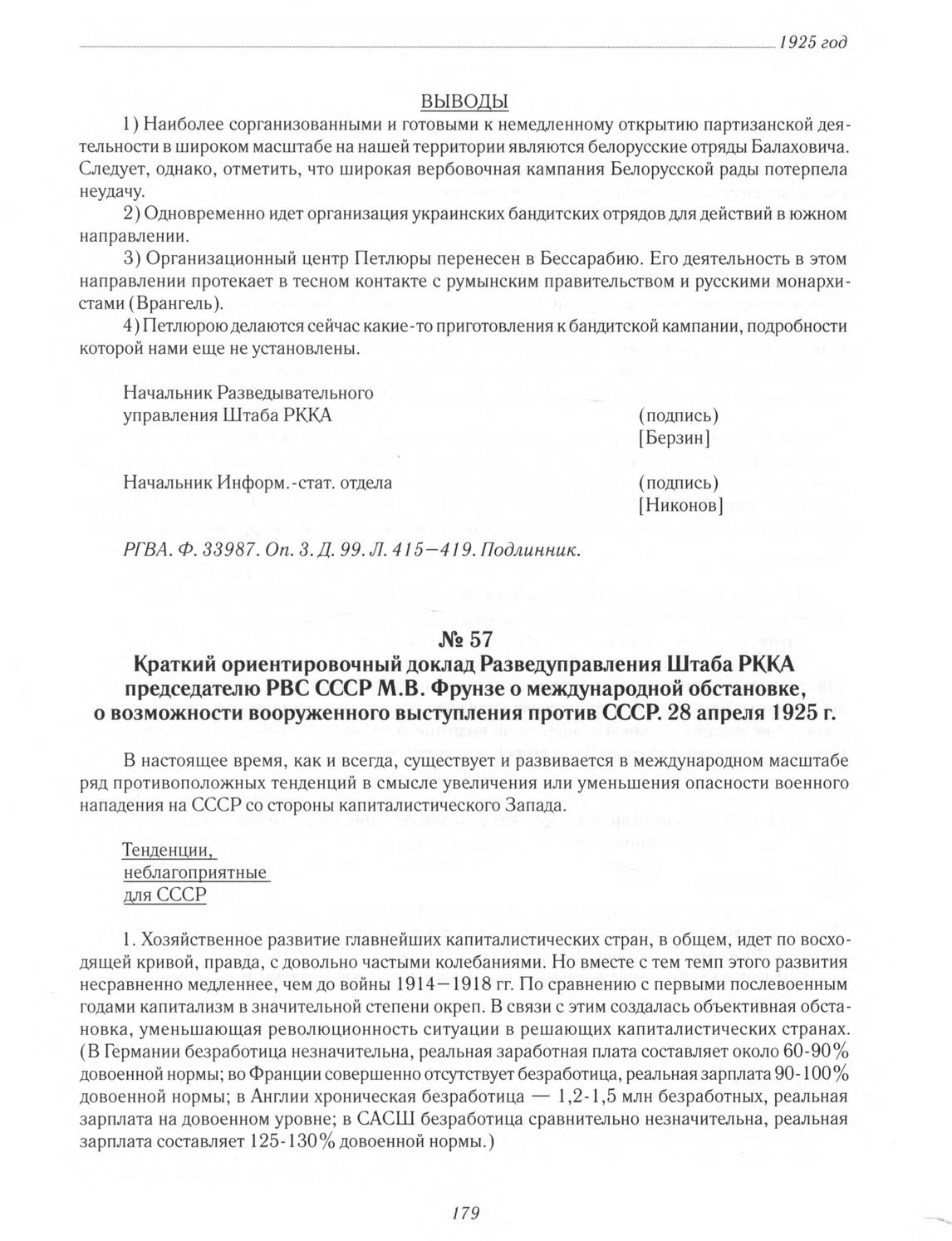 Краткий ориентировочный доклад Разведуправления Штаба РККА председателю РВС СССР М. В. Фрунзе о международной обстановке, о возможности вооруженного выступления против СССР. 28 апреля 1925 г. // РГВА. Ф. 33987. Оп. З. Д. 99. Л. 375-377 об., 381 об.-382 об., 386 об.-388 об., 393-394 об., 397-401. Подлинник.
