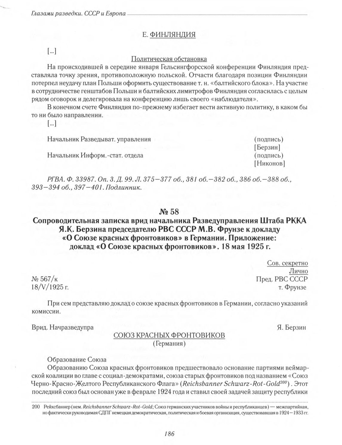 Сопроводительная записка врид начальника Разведуправления Штаба РККА Я. К. Берзина председателю РВС СССР М. В. Фрунзе к докладу «О Союзе красных фронтовиков» в Германии. Приложение: доклад «О Союзе красных фронтовиков». 18 мая 1925 г.