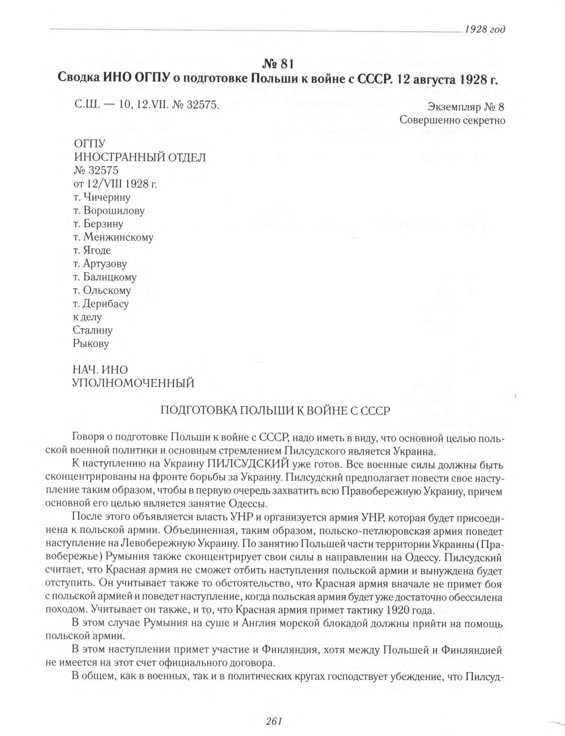 Сводка ИНО ОГПУ о подготовке Польши к войне с СССР. 12 августа 1928 г. // ЦА ФСБ РФ. Ф. 2. Оп. 9. Д. 875. Л. 319-320. Копия.