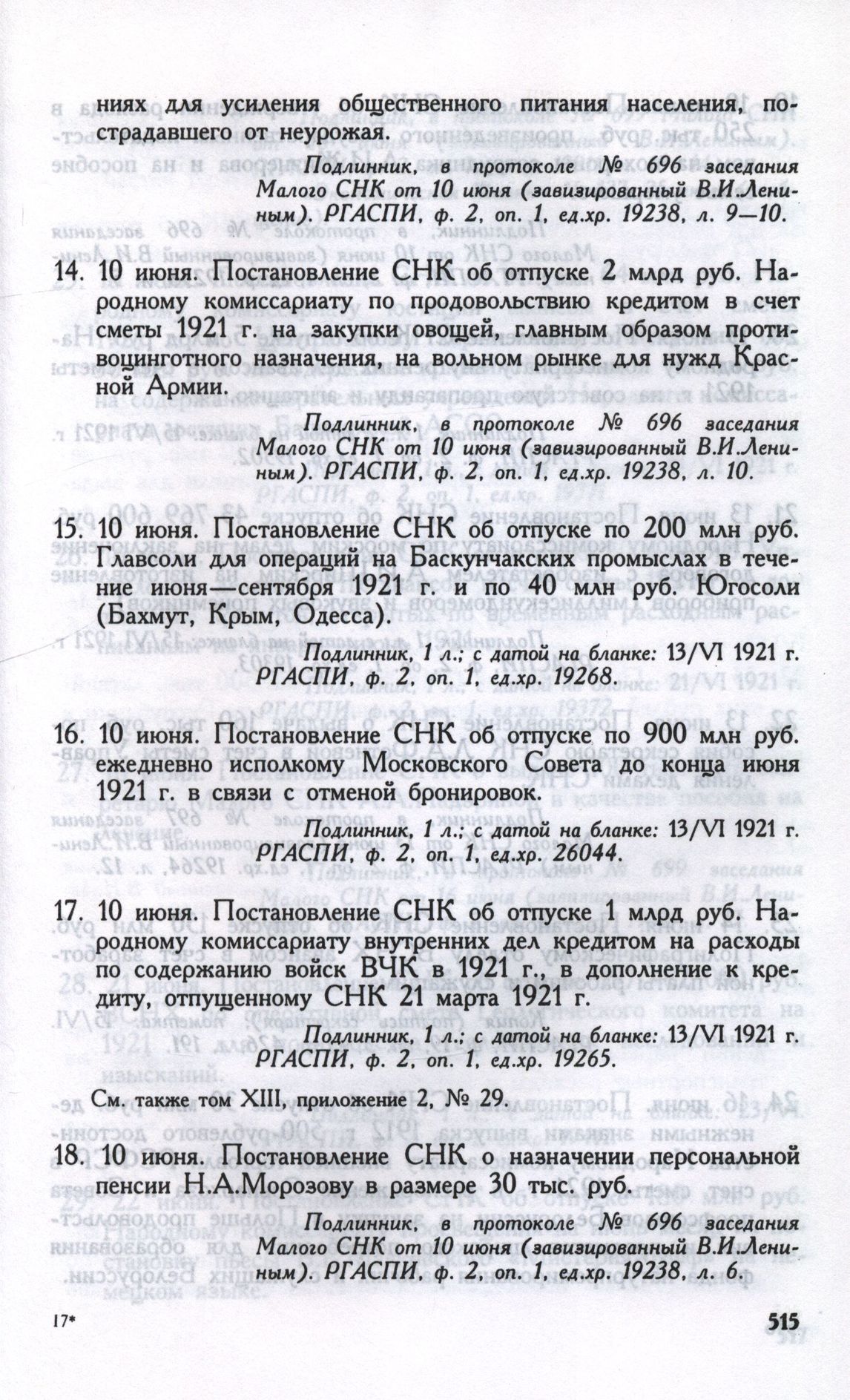 10 июня. Постановление СНК об отпуске 1 млрд руб. Народному комиссариату внутренних дел кредитом на расходы по содержанию войск ВЧК в 1921 г., в дополнение к кредиту, отпущенному СНК 21 марта 1921 г.