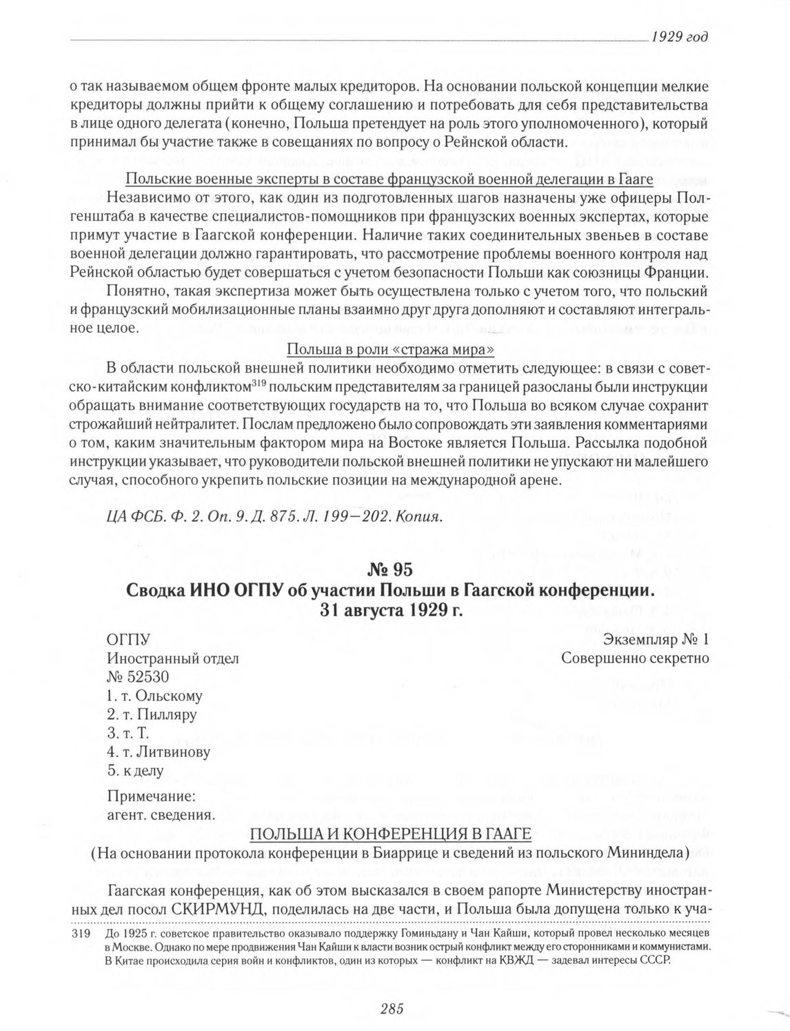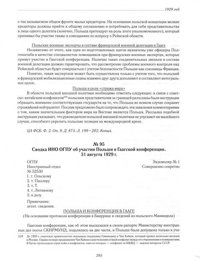Сводка ИНО ОГПУ об участии Польши в Гаагской конференции. 31 августа 1929 г. // ЦА ФСБ РФ. Ф. 2. Оп. 9. Д. 875. Л. 194. Копия.
