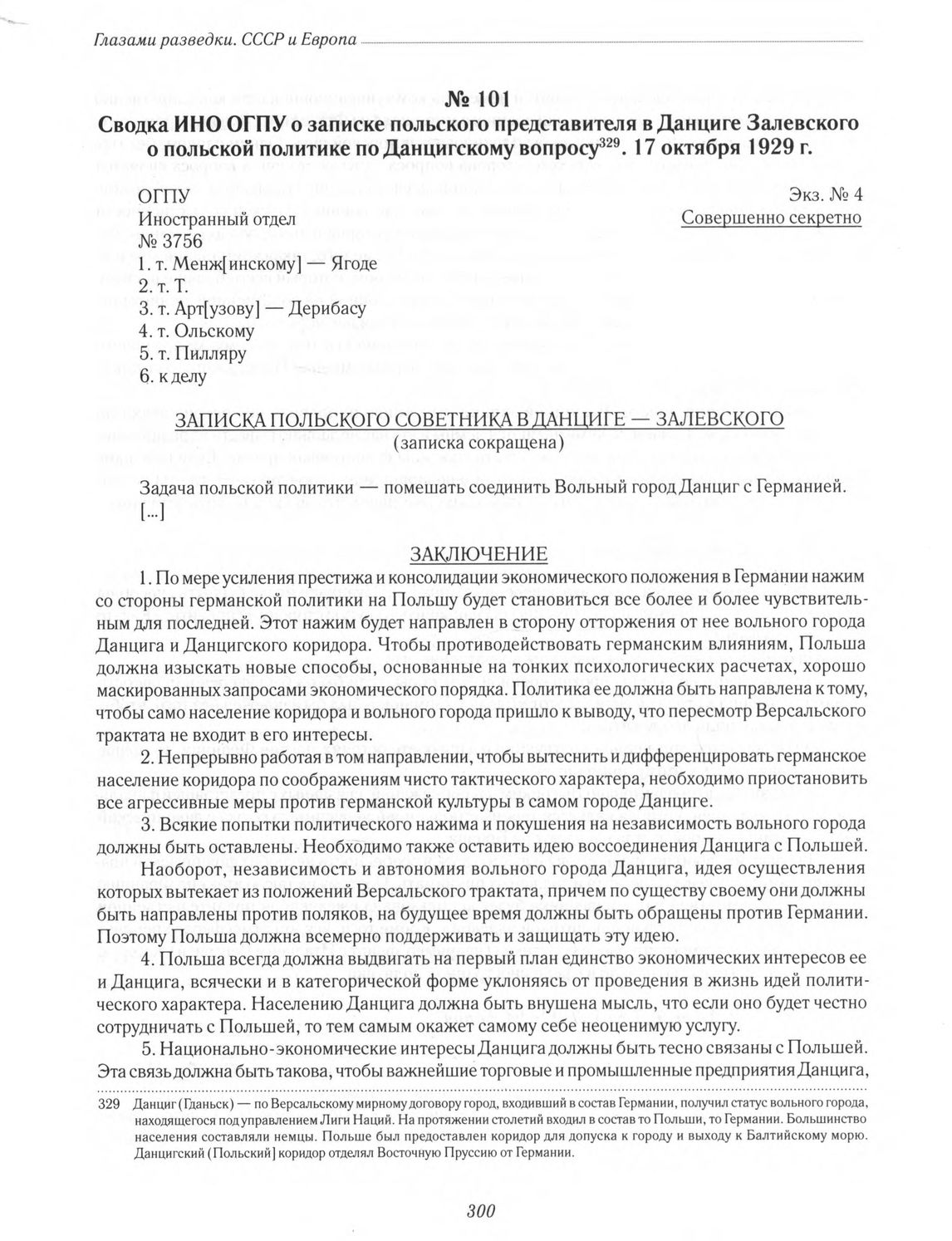 Сводка ИНО ОГПУ о записке польского представителя в Данциге Залевского о польской политике по Данцигскому вопросу. 17 октября 1929 г. // ЦА ФСБ РФ. Ф. 2. Оп. 9. Д. 875. Л. 72-79. Копия.