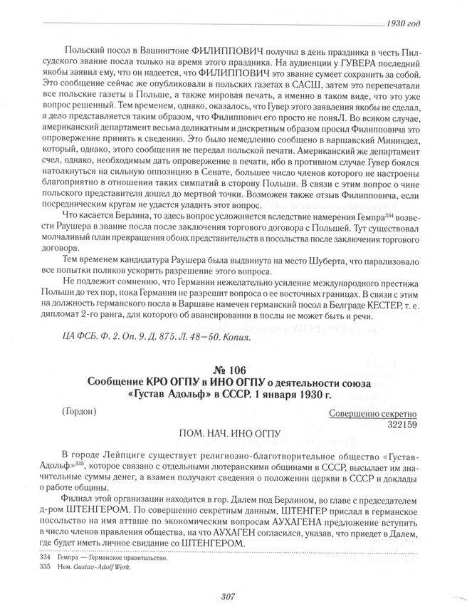 Сообщение КРО ОГПУ в ИНО ОГПУ о деятельности союза «Густав Адольф» в СССР. 1 января 1930 г.